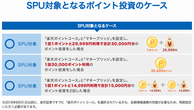 以前のSPUは、楽天証券で「楽天ポイントコース」を設定して、毎月500ポイント以上のポイント投資(投資信託)をするだけで+1倍の恩恵が受けられました。